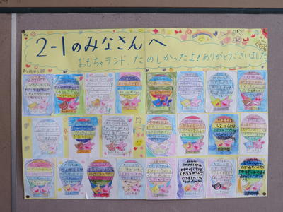 2年生の廊下に、1年生からのお礼の手紙が掲示されていました。昨日のおもちゃ祭りへのお礼の気持ちが書かれていました。掲示を見て、心がほっこりしました。とても、いいな~~~~ですよね。