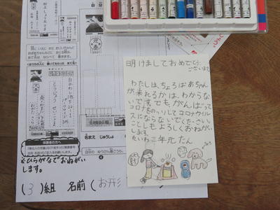 2年生の様子です。かわいらしい年賀状を書いたり、2学期の学習のまとめをしたりしていました。イラストが入った年賀状をもらった人は、心がほっこりですよね。また、まとめに頑張っていたので、頭の中もほっこりしたはずです。