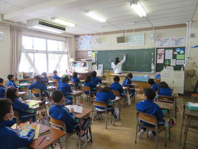 5年生が外国語と音楽の学習をしていました。テレビに映し出された画像は何かが燃えている画面でした。オスカー先生によると案山子(かかし)を燃やしているということでした。その訳は・・・。(途中で教室を出たの分かりませんでした。すみません。)音楽は「スキーの歌」で、手拍子と足拍子でリズムをとっていました。足拍子で音楽室が揺れていました。すごい。