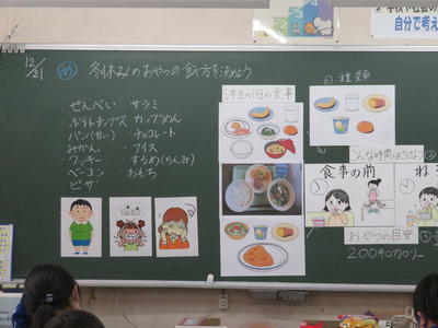 5年生が冬休みを前に、「冬休みのおやつの食べ方を決めよう」という学習をしていました。担任と栄養士とのTTでの授業でした。寒くなると、どうしても動くのがいやになり、こたつでゴロゴロ、お菓子をパクパクしてしまうということがありますよね。自分の生活を省みて、「おやつ」について意識しする機会となったようです。冬休み中、頑張ってみよう。一生懸命考えて、頭がほっこりです。