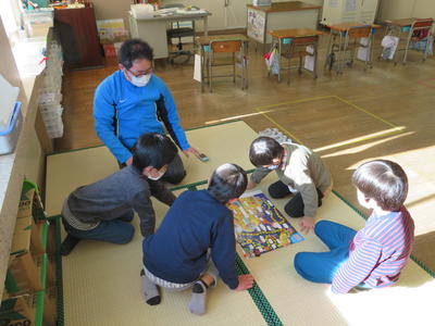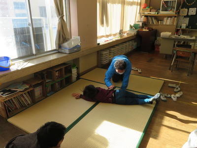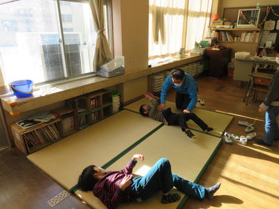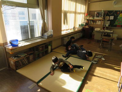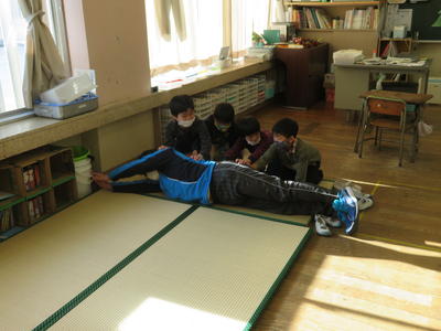 3時間目にさくら学級がお楽しみ会をしていました。ゲームの一つとして、「畳の上でゴロゴロ」というのがありました。みんな喜んでゴロゴロしていると、先生がゴロゴロと押してくれました。みんな大喜びです。そこでみんなで先生をゴロゴロすることにしたら・・・・・これは大変だ。なかなか回らない。がんばれ~~~。