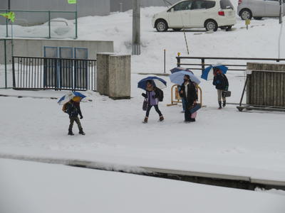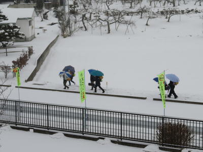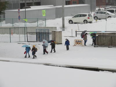とても寒い朝となりました。そして「雪」といよりも「氷」のような雪が降っている朝でした。「バラバラ」という音が聞こえていました。かなり寒かったのですね。児童たちは滑らないように気を付けながら登校してきました。