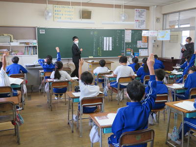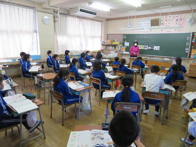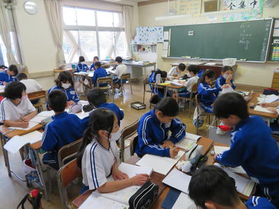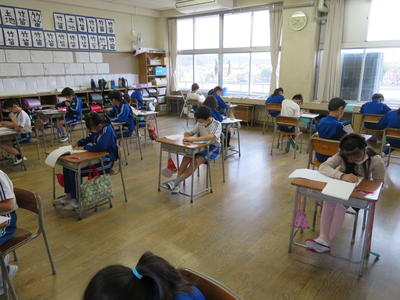 4年生の様子です。算数の計算問題の復習や練習のプリント、国語のごんぎつねの学習でした。教え合いながら取り組んでいる姿も見られ、しっかりしてきたなという感じがしました。高学年に向けて、さらに頑張っていこう。