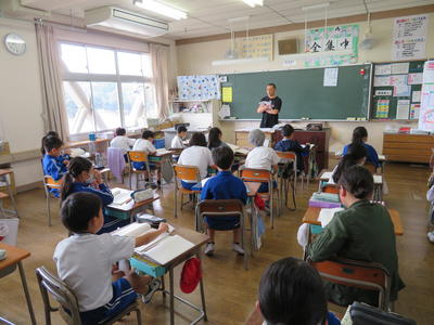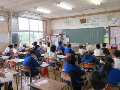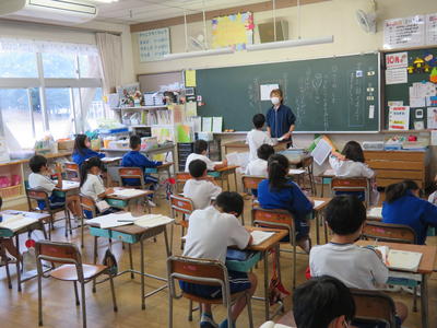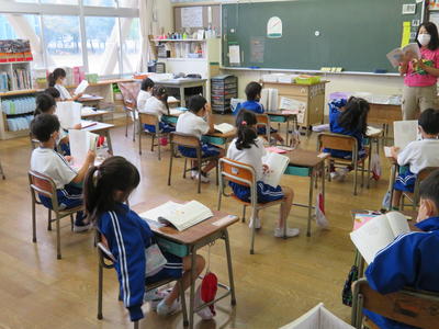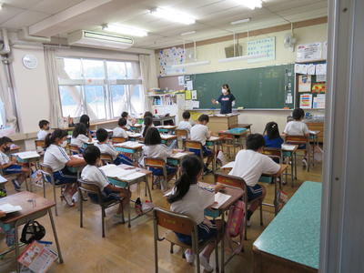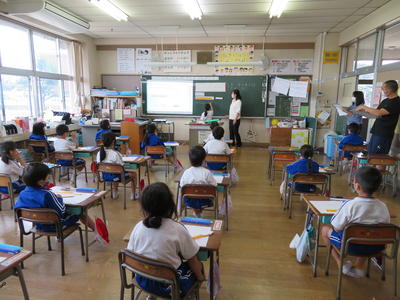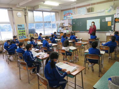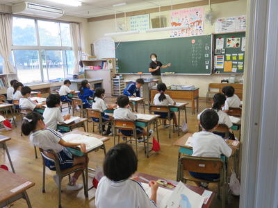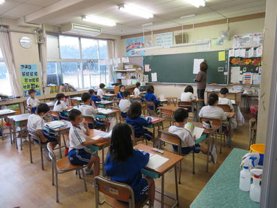 校舎の1階をのぞいてみました。1年生と2年生が頑張っている姿が見られました。1年生は3学級とも国語の授業でした。きちんと教科書を持ち、元気に音読している姿がとてもかわいらしかったです。