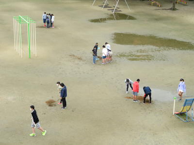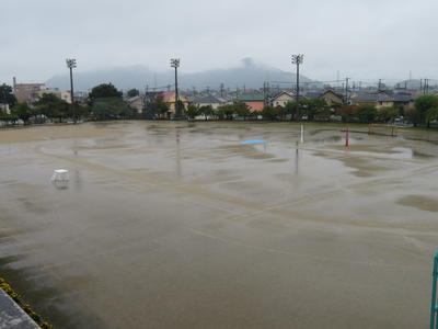 今日の校庭です。頑張っている児童たちのためにも、できれば、よい状況の中で運動会を行いたいと考えています。実施については、天気図(天気予報)と校庭の状況(水はけの具合等)などから判断します。10日(土)から変更する場合は、決定次第、お知らせします。