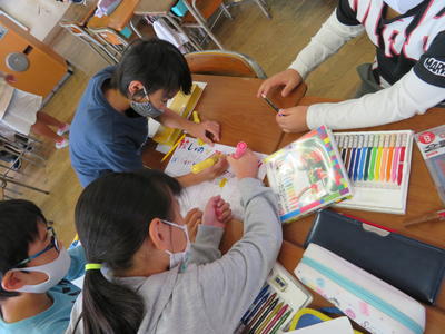 3年生の様子です。総合で調べた「北沢又小学校の良さ」を、グループごとにまとめていました。