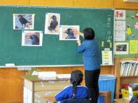 鳥の写真を見せてくださいました。それは,誰もが知っている身近な鳥,カラスです。