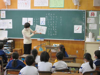 朝の読書タイム、読書ボランティアサークル「おはなしおばさん」の皆様が来校くださり、1年生の各クラスで