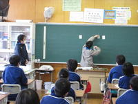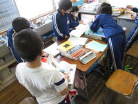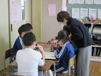 古関先生と担任の先生が、調べるヒントを与えると、「なるほど」と 夢中になって調べる子どもたち。