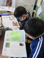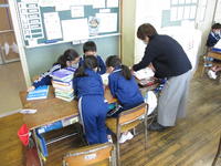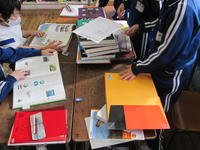 今回の授業のために先生は、どのグループも百科事典を1セット使えるようにと、近隣の学校から百科事典を借り集めて、学習の準備をしてくださいました。
