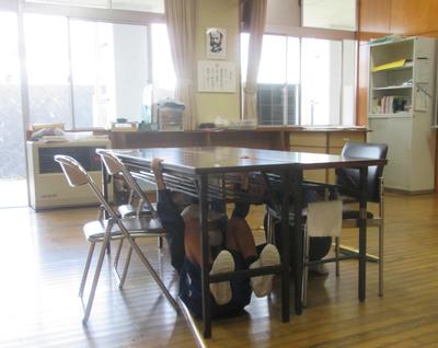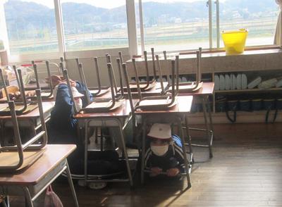 子どもたちはそれぞれ、清掃担当場所に分かれていましたが、地震発生(訓練)を告げる放送にじっと耳を傾けると、すかさず身の安全を確保していました。