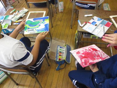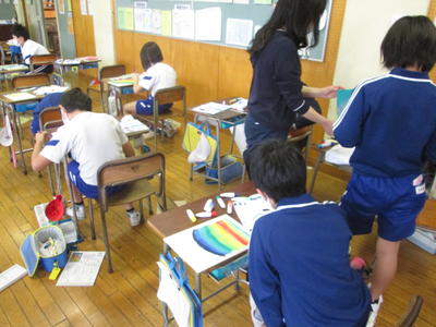 校内を巡ってみると、5年生教室からは、何やらアートの香りが・・・。