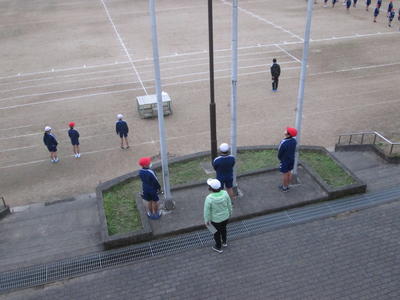 体育主任の先生が、「みんなで~をします」「次は~です」と全体に呼びかけると、