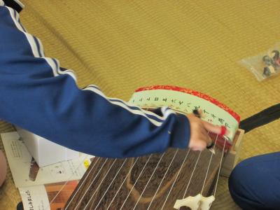 グループに分かれ、交代しながら一人ひとり筝を演奏してみます。きれいな音が響きだしました。