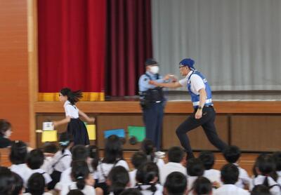 実際に不審者に遭遇した際に逃げられるかどうかを3年生が実演してみました。