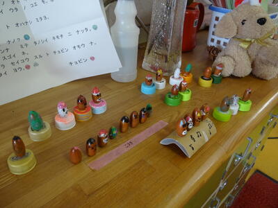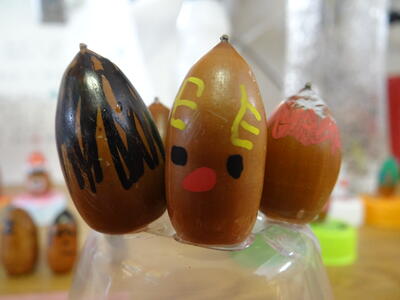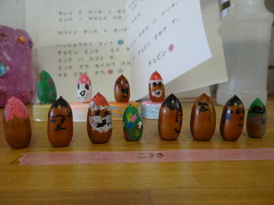 千葉大学附属幼稚園から大きなどんぐり、松ぼっくり、銀杏が、今年も届きました。千葉大学附属幼稚園とは東日本大震災以来、どんぐりを通しての交流が続いています。いただいたお礼に、どんぐりで作った楽しいものを送ろうと、年長のすみれ組さんたちは張り切っています。
