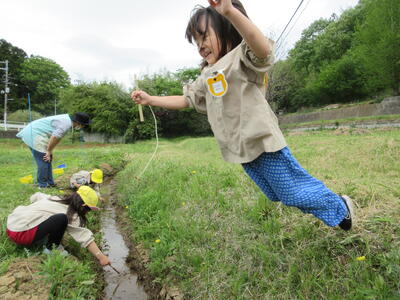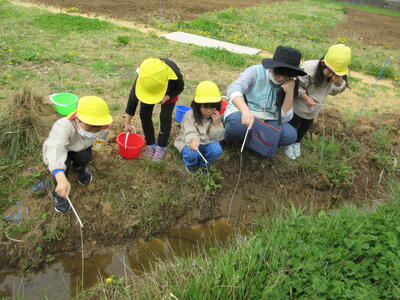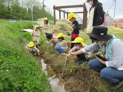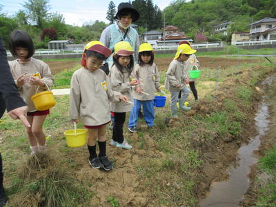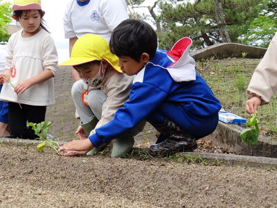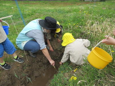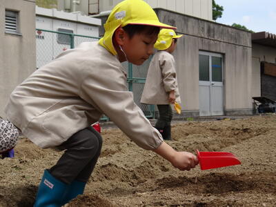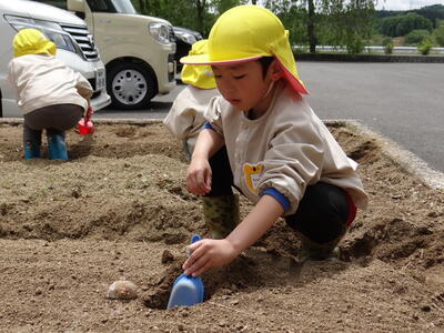さっそく園児たちも挑戦です。もう1本の大きく育ったイモを、全員で交代しながら掘りました。