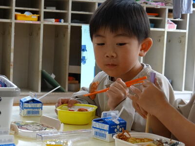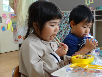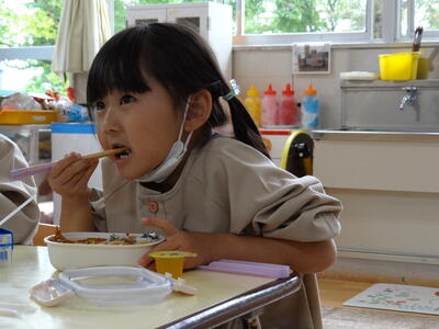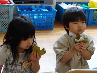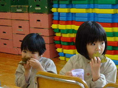 昼食時には、紅芋と白菜の味噌汁、そして地域の方から園児たちにといただいた紅芋入りのパウンドケーキをいただきました。