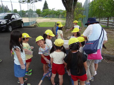 6月27日午前中の好きな遊びの時間、一人の園児が「カブトムシが上に出てきちゃった!」と叫んで、昆虫に詳しい友だちを呼びに行きました。そうしたらその友達も「カブトムシが上に出てきちゃった!」と大騒ぎ。あっという間に人だかりです。