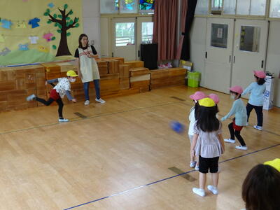 年長さんは、遊戯室でドッチボール。