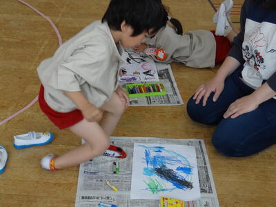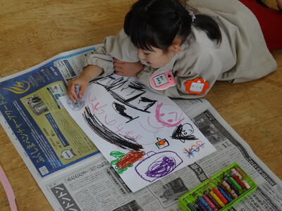 年少さんは、金曜日の「春の親子遠足」で行った安達ケ原ふるさと村で、楽しかったことの絵を描いています。