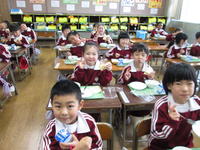 給食も行儀よく食べることができています。今日のメニューはツナサンド。チーズのフィルムをはがすのに苦労する様子も見られましたが、みんな「おいしい!」と言って食べていました。
