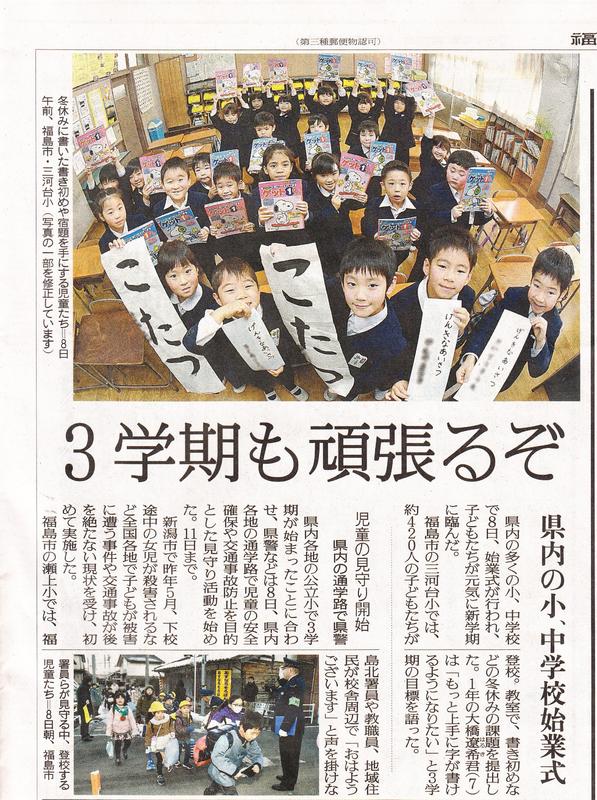 新年あけましておめでとうございます。静かだった学校校舎に元気の良い子どもたちの声,笑顔が戻ってきました。今日から3学期。52日間のスタートを,猪突猛進 勢いよく駆け出したいと思います。(記事:福島民友 1/9付)