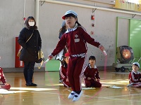 運動不足になりがちな冬の体力づくりの一環として、各学年で「なわとび記録会」を実施しています。今日は1年生のなわとび記録会でした。今まで1回も跳べなかった子も、練習を積み重ねているうちに、どんどん上達して自己記録を大幅に塗り替えることができました。保護者の皆様の声援も励みになっているようです。寒い中、応援ありがとうございます。寒さに負けずがんばれ!がんばれ!