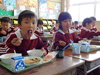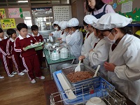 学級のお友達と協力しながら,上手にこぼさず給食を配り終え