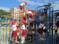 その後、まず、1年生たちが遊具の使い方の説明を受け、さっそく、遊具で遊びました。