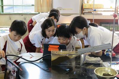 6年生が理科の時間に、「流水の働きによって 地層はどのようにできたのか」を実験で確かめていました。