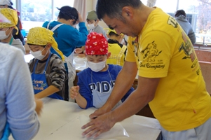 収穫した米を使って、米粉ピザも作りました。パイ生地をつくり、それをのばしているところです。