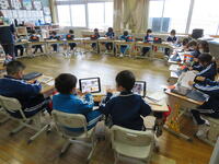 1年生はプリントで10になる数を見つけました。2年生は顔に見える物を探してタブレットで写真を撮りました。3年生は体で音を表現しました。4年生は漢字の学習をしました。