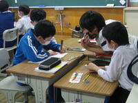 1年生はボール運動。2年生はタブレットを使って算数の謎解き。3年生はトランプを使った算数のゲーム。4年生は「This is my day.」を行いました。