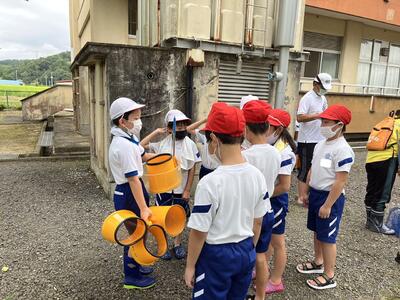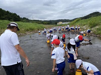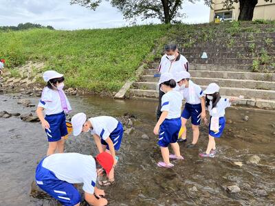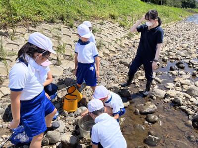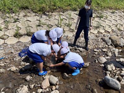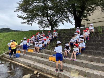 9月6日 1・2年生が水原川にどんな生き物がいるか観察しました。