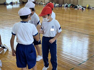 水原川の生き物の観察を行なった後、水原小学校の3年生と松川小学校の3年1組のお友達と全員で集団活動ゲームを体育館で行いました。