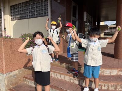 9月1日 登校した1・2年生が自分達の畑の野菜を収穫しました。