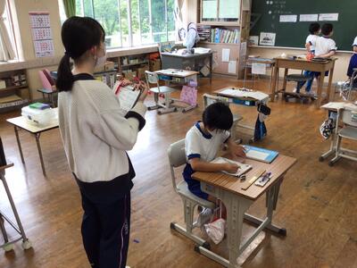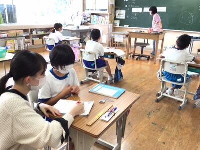 1・2年生、3・4年生、6年生と日替わりで学級に入り、授業の進め方や教師としての働きかけなどを学んでいきます。
