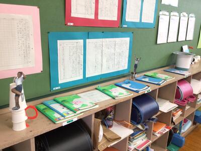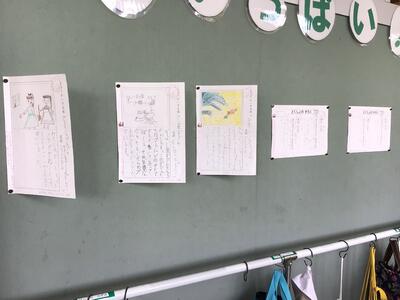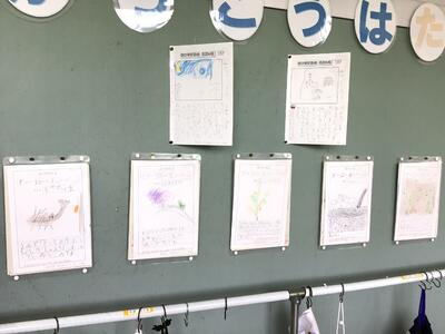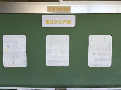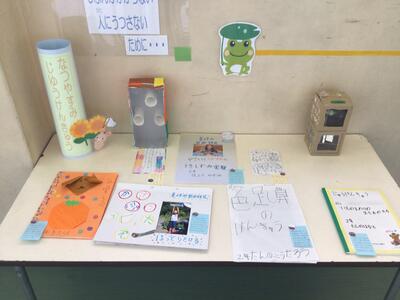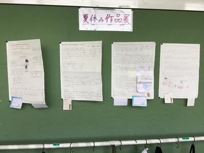 夏やみに取り組んだ自由研究などの作品や課題を各クラスの廊下や昇降口に掲示しています。