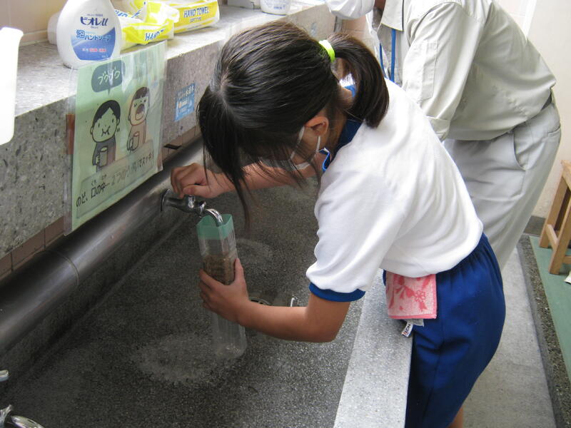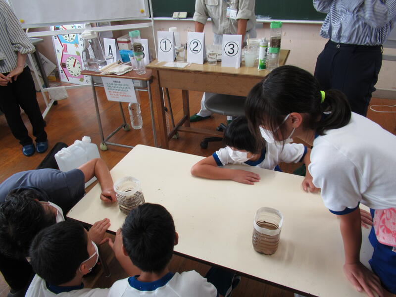 実験は,ダムの濁った水が,沈殿,ろ過の過程を経て「飲めるんじゃない?」と思えるほどきれいになるところまで行いました。