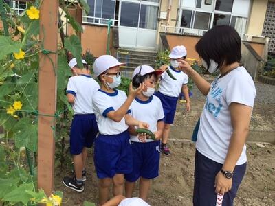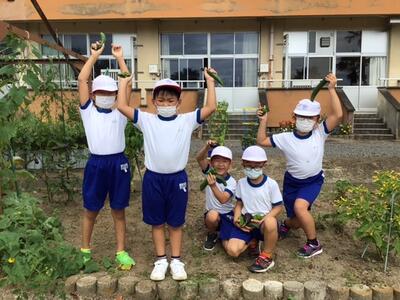 8月25日 1・2年生の育てていた野菜を収穫しました。