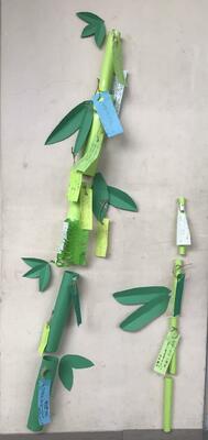 廊下に七夕飾りを見つけました。全校児童と職員の願い事が書かれた短冊が飾られています。