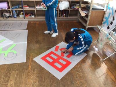 3月3日 閉校に向け、校舎や体育館の窓に飾るメッセージボードを作成中です。