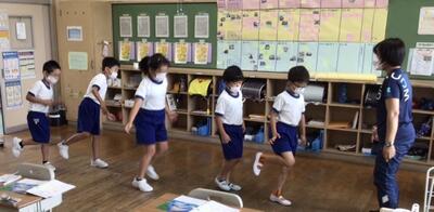 3拍子のリズムに乗って足で「外 中 中」「外 中 中」と拍子を取ります。2年生は上手にできましたが、1年生は、足でリズムをとるのは少し難しそうでした。