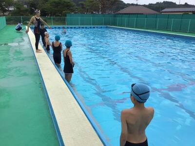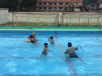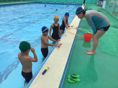 低学年の児童は、安齋先生の指導のもと、石拾いや輪くぐりをして泳ぐための基礎訓練を楽しくこなしていました。