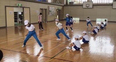 また、2年生はリズム遊びで「バンブーダンス」 のステップの練習をしました。