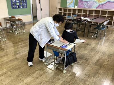 縦画や横画の太さや筆のはらいや止め、横画の間隔など注意しながら真剣に清書を仕上げていました。清書の作品の選定を本人の意向や友達の評価も交えて行っていました。