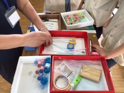 スーパーボールは小さいものから中ぐらいのもの、そして、大きいものとあり、子ども達は、高くまでストローのロケットを飛ばすために落とす高さを変えたり、スーパーボールの大きさを変えたり、ビニールテープのおもりを少し重くしたり工夫しながら楽しく実験をしていました。