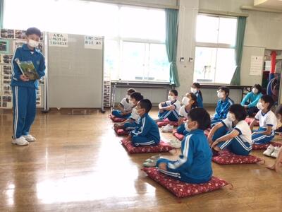 6年生の代表の児童が「バムとケロのおかいもの」という本で読み聞かせを行いました。