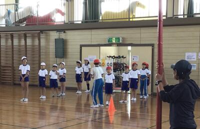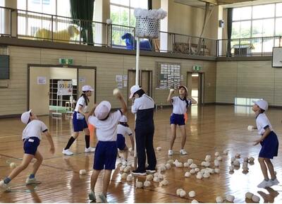 本日3校時目はプールの予定でしたが、水温が低いため、プールの授業の代わりに全校児童で雨天時に体育館で行う予定であった運動会の競技を行いました。
